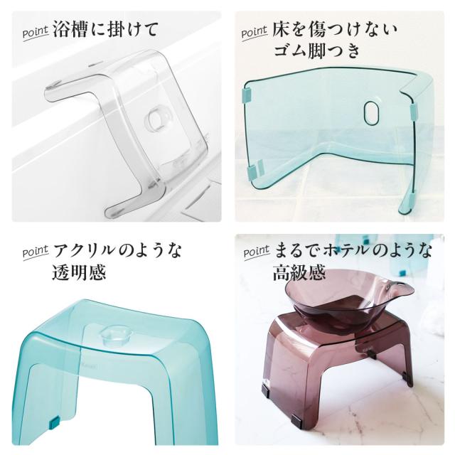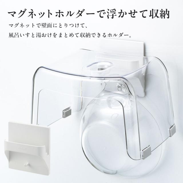 クリアな素材でスタイリッシュなバスチェアと湯おけ、マグネットで壁面に取り付けられる収納ホルダーの3点セット。