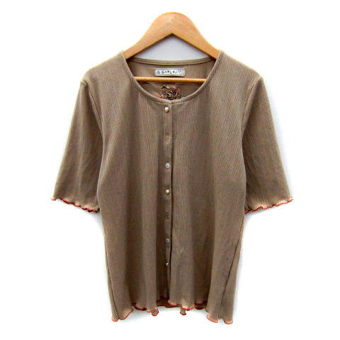 【中古】スカラー ScoLar リブニットカーディガン 五分袖 ラウンドネック 無地 刺繍 M ライトブラウン レディース