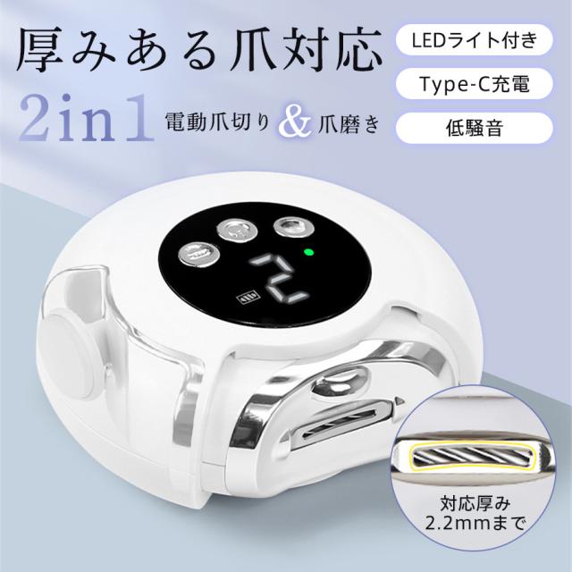 2in1 電動爪切り 爪削り 爪磨き 高齢者 介護 厚爪爪切り 深爪防止 LEDライト付き 足の爪 ネイルケア 充電式 コンパクト
