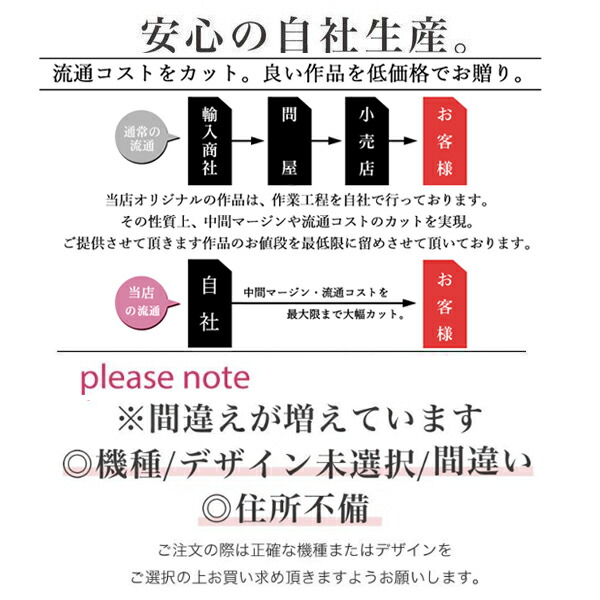 | ・側面までカバーする形状のポリカーボネート製カバーを用いてお一つおひとつ、心を込めて製作させて頂きます。 ・印刷面は二重加工でコーティングされますので傷・水にも強いのが特徴。 ・機種ごとに専用のハードケースでお作り致します。 iPhone (アイフォン) Xperia (エクスペリア) AQUOS (アクオス) oppo (オッポ) Galaxy (ギャラクシー) pixel (ピクセル) ... Android (アンドロイド) 各種 お取り扱いさせて頂いております全機種専用のケース・カメラホール(指紋認証ホール)にて心を込めて製作させて頂きます。 女性(レディース)、男性(メンズ)ともに使えるスマホケース。 誕生日プレゼントやギフト、贈り物にも。 お品とともに笑顔もお贈り出来れば幸いです。 |