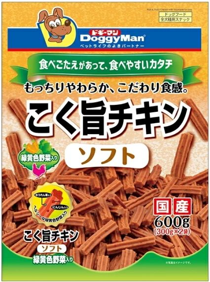 チキンの旨みと香りをギュッととじこめて、肉質感をいかし、にんじんとほうれん草をプラス。やわらかく、わんちゃんの好みに応じた大きさにちぎれるので噛むチカラが弱い幼犬やシニア犬、おくちが小さな超小型犬にもおいしく食べられます。