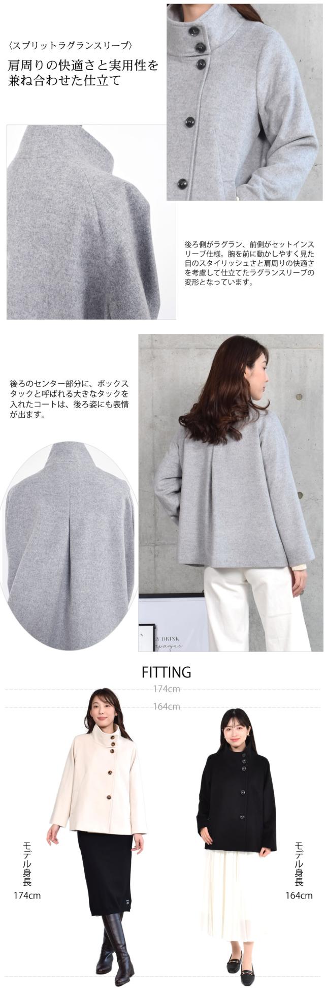 上品なウール100%素材を使用したスタンドカラーの2WAYショートコート。一番上まで留めると寒さ対策のスタンドカラーに。スタンド部分のボタンを外して衿を開けると、首周りスッキリのオープンカラーに。フロントのボタンを外して着ると衿のきざみが開けた時のアクセントになり、上品で華やいだ印象になります。また、バックスタイルはラグランスリーブなので背中にゆとりがあり、腕が動かしやすさく、前から見るとスッキリ見えするのがポイントです。しなやかで繊細なウール100%生地のコートは、寒い冬を快適に過ごすために最適なアイテムです。