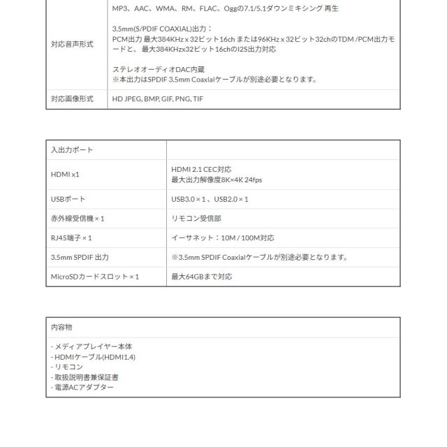 ※本製品は最大解像度8Kファイルの再生が可能ですが、HDMI出力は4Kとなります。