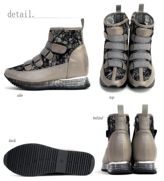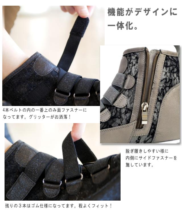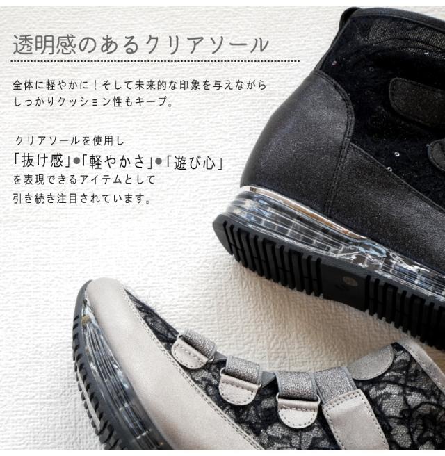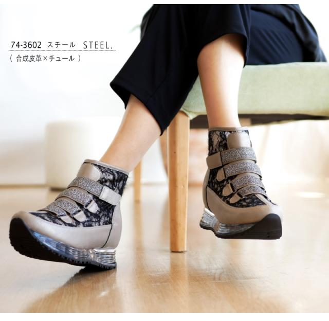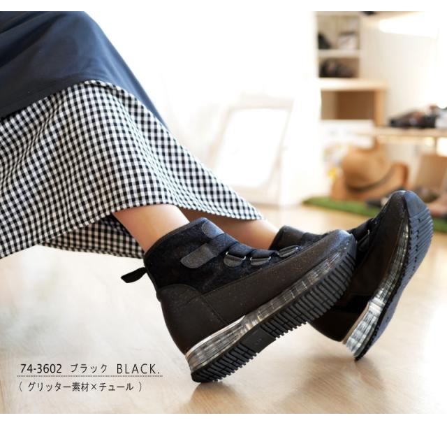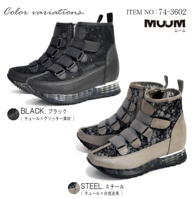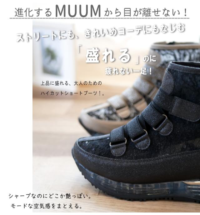 ショートブーツ レディース 歩きやすい 厚底 ボリューム インヒール クリアソール MUUM ムーム チュール シアー グリッター 黒 スチール スパンコール 滑りにくい ゴムベルト ファスナー 3e