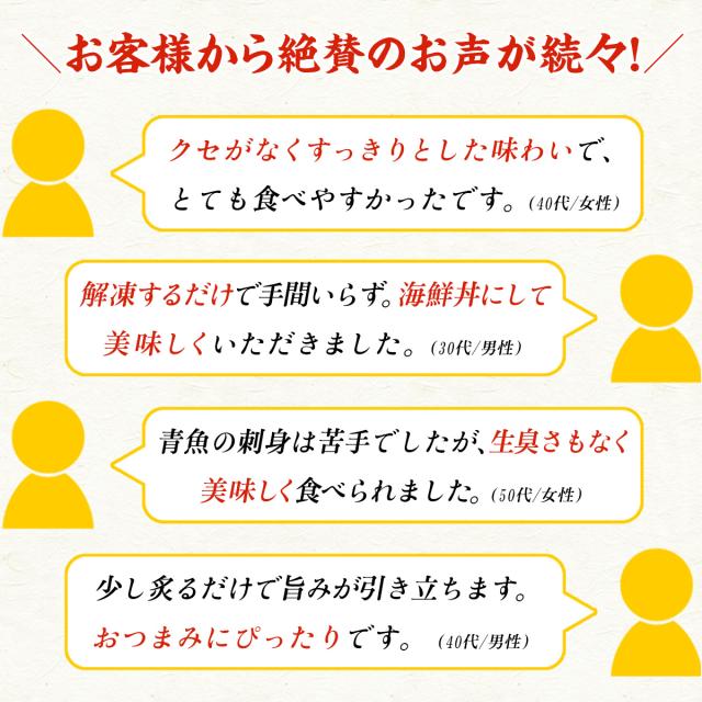 しつこさのない、すっきりとした後味で食べやすく、青魚が苦手な方にもおすすめです。 下処理不要で、解凍するだけですぐにお刺身としてお召し上がりいただけます。 酸化や劣化を防ぐガス置換パック入りで、生臭さも感じにくく安心。