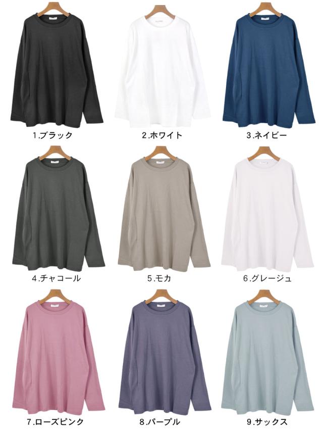 【カットソー ロンT レディース 綿100 長袖 トップス コットン 無地 シンプル ゆったり ワイド 大きめ ルーズ クルーネック 体型カバー デイリー 着回し 定番 くすみカラー 白 黒 ホワイト ブラック】