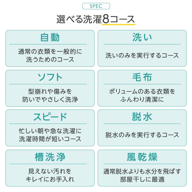 8種類の洗濯コースを搭載し、スピードモードや予約タイマー、ほぐし脱水、風乾燥機能など便利な機能を備えています。