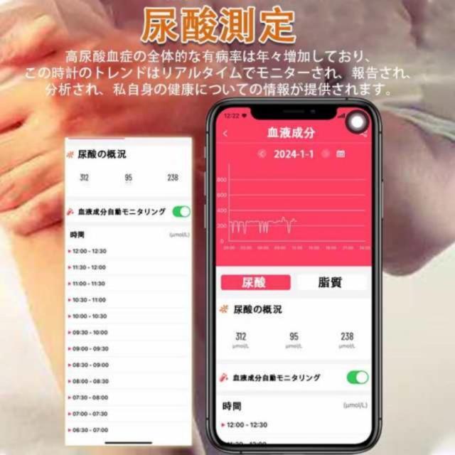 主な機能:心電図、血圧、血液成分 (尿酸、血中脂質)、体組成、HRV レポート、赤色光血中酸素、科学的睡眠モニタリング、着信通知 (電話/メール/SMS/SNS)