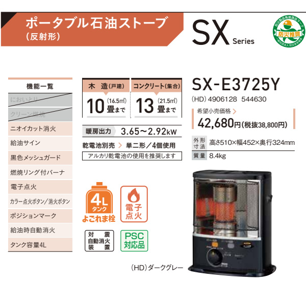 ポータブル石油ストーブ SXシリーズ ■暖房のめやす 木造(戸建)10畳まで(16.5m2) コンクリート(集合)13畳まで(21.5m2) ■暖房出力:3.65〜2.92kW ■外形寸法:高さ510×幅452×奥行324mm ■質量:8.4kg ■タンク容量:4L ■その他:[乾電池別売]単二形/4個使用 (アルカリ乾電池の使用を推奨します) ※記載は商品仕様の一部です。仕様説明不足等の理由での返品はできません。特に適合等は必ずご確認ください。