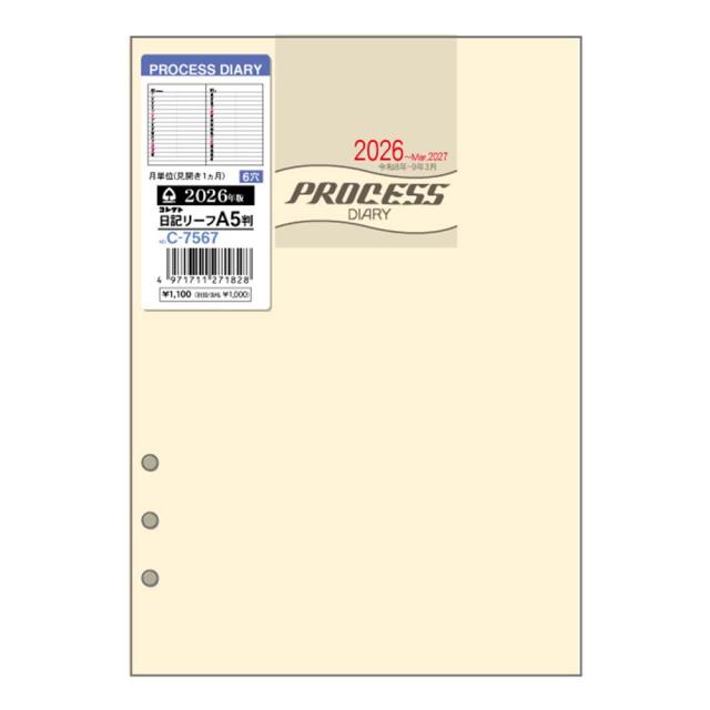 【メール便発送】コレクト 手帳用リフィル 2026年 日記リーフ(プロセスダイアリー 15ヶ月用) 見開き1ヶ月横罫 A5 6穴 C-7567