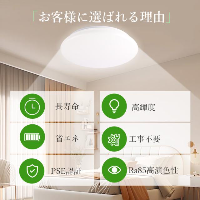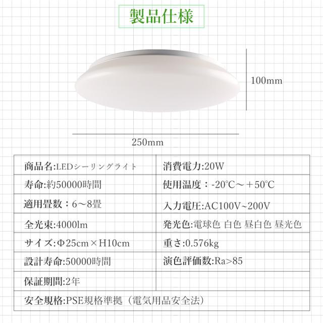 薄型で直径25cm、高さ10cmの軽量コンパクト設計。電球色から昼光色まで4色の光色が選べ、高演色Ra85で自然な色合いを再現します。消費電力20Wで4000lmの明るさを実現し、省エネ性能も抜群。超寿命5万時間で交換不要。工事不要で簡単取付、虫やホコリが入りにくい密閉構造。安心の1年保証&PSE認証取得済みで、長く快適にご使用いただけます。