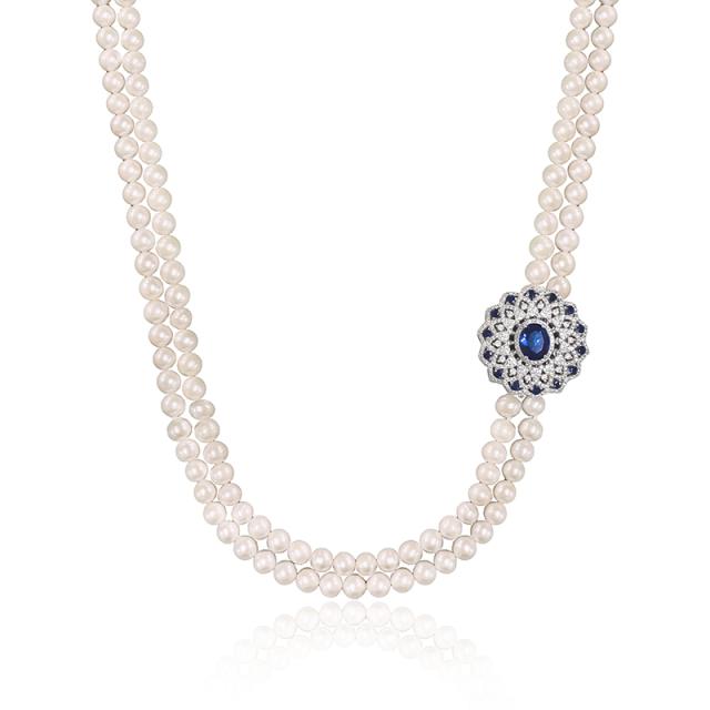 上品な白いパールが連なるこのアクセサリーは、真ん中に配置されたサファイアカラーの宝石とシルバーの装飾が特徴的です。