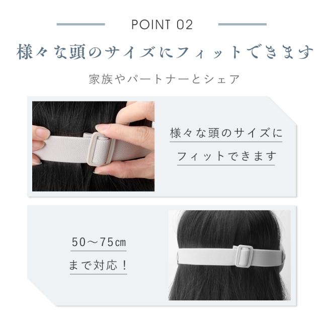 ベルトは50〜75cmまで自由に調整でき、頭のサイズに合わせてしっかりフィット。家族やパートナーともシェアして使えます。また、可視化レンズを採用しているため、装着中も視界が確保されて安心。タイマーモード付きで寝落ちしても自動でオフになるので、夜間使用にも最適です。