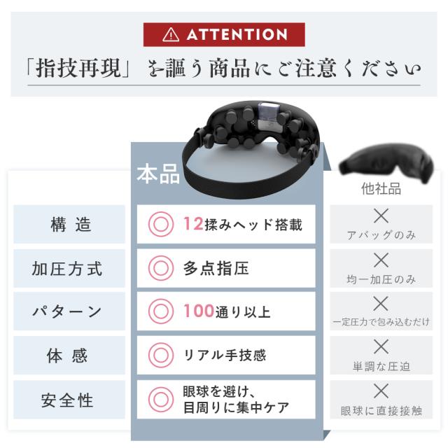 12個の独立したマッサージヘッドが、指圧のような多点アプローチを実現。100通り以上の振動パターンと4つのモードを自由に組み合わせることで、目もと周りの筋肉やツボにしっかり届き、奥深くまで心地よく刺激。人の手では届かない細かい部分にも対応し、まるでプロの施術を受けているかのような本格ケアが自宅で体感できます。