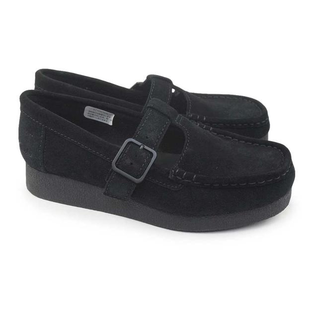 ワラビーのスタイルに欠かせないやわらかいスエードのアッパーとクレープ風ソールはそのままに、バックルがついたTバーのデティールがクラシックな印象を与える一足。