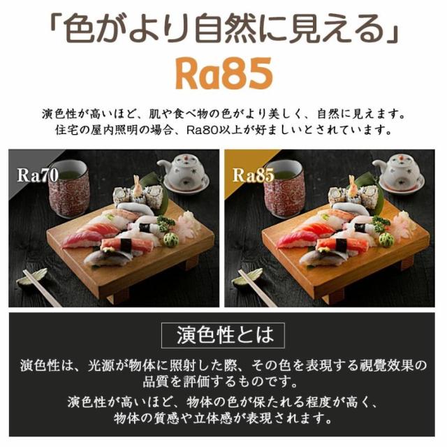 演色性が高いほどのシーリングライト、自然光に近いとされているので、文字がはっきりと見やすく、花の色や料理の色や人の肌色美しく自然に見えます。廊下、和室、寝室、洗面所、居間、書斎、トイレ、天井照明、キッチン照明が最適です。