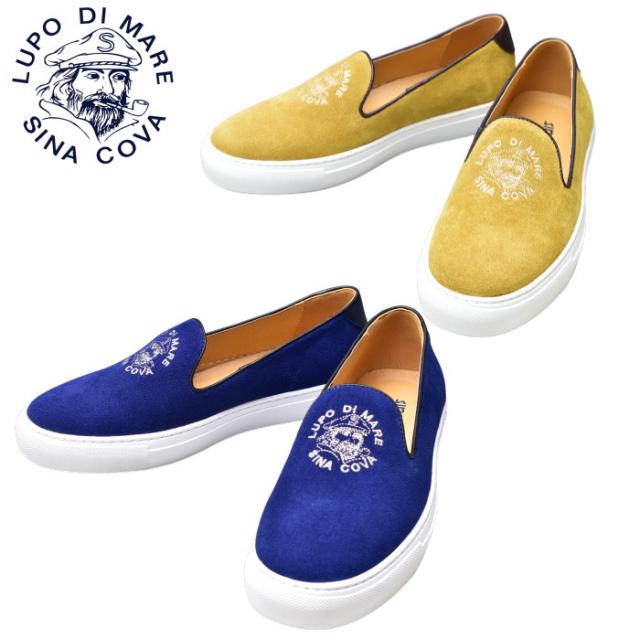 ・アッパーにシナコバシンボルロゴの刺繍を施した本革スエードスリッポン。