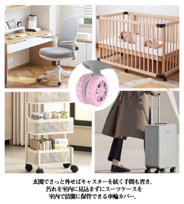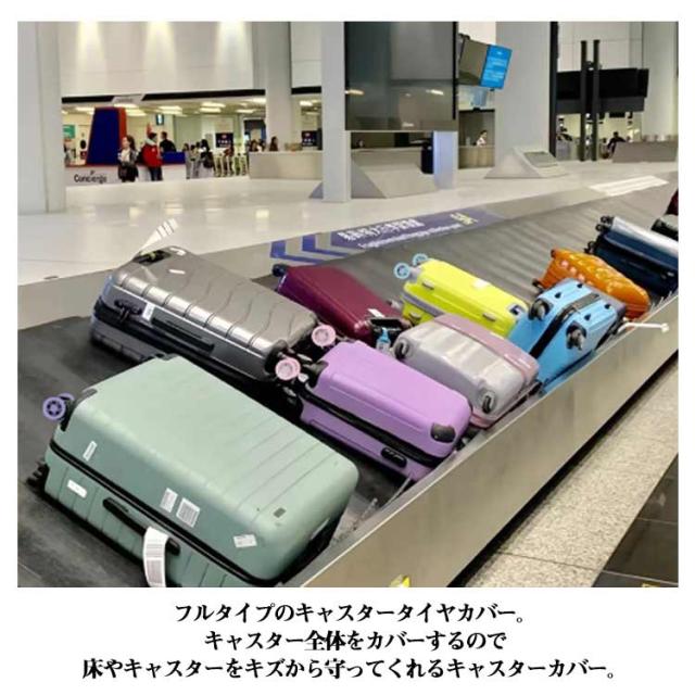 | 外れにくい、騒音軽減、室内を清潔に 8個セット フルタイプのキャスタータイヤカバー。 キャスター全体をカバーするので、床やキャスターをキズから守ってくれるキャスターカバー。 移動時のゴロゴロ音を抑え、深夜や早朝でも安心。 かぶせるだけで装着OK!伸縮性があるので様々なキャスターにフィット。 玄関でさっと外せばキャスターを拭く手間も省き、汚れを室内に見込まずにスーツケースを室内で清潔に保管できる車輪カバー。 旅気分を盛り上げる華やかな桜柄。おしゃれで個性的に。海外旅行時、自分のスーツケースの目印にもなり、荷物が見つかりやすく、ターンテーブルからスーツケースが出て来るのが楽しみになりますね。 桜柄がかわいいフルカバータイプのキャスターカバーで、床を傷つけず、キャスターのゴロゴロ音も軽減! お部屋でも旅先でも、静かに・快適にキャリーケースを使えます。 | |