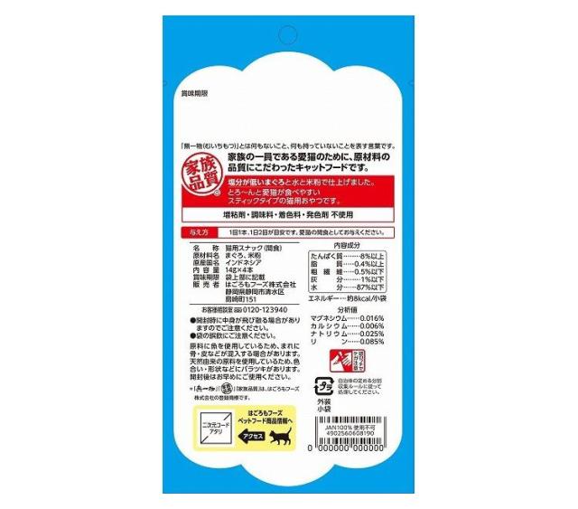 塩分が低いまぐろと水と米粉で仕上げました。とろ〜んと食べやすいスティックタイプの猫用おやつです。