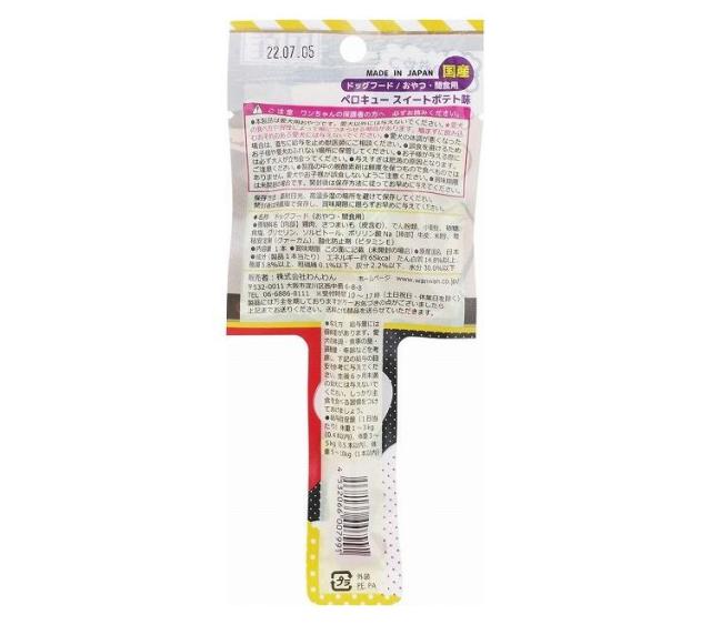 【肉部】鶏肉、さつまいも(皮含む)、でん粉類、小麦粉、砂糖、食塩、グリセリン、ソルビトール、ポリリン酸Na【棒部】牛皮、米粉、増粘安定剤(グァーガム)、酸化防止剤(ビタミンE)