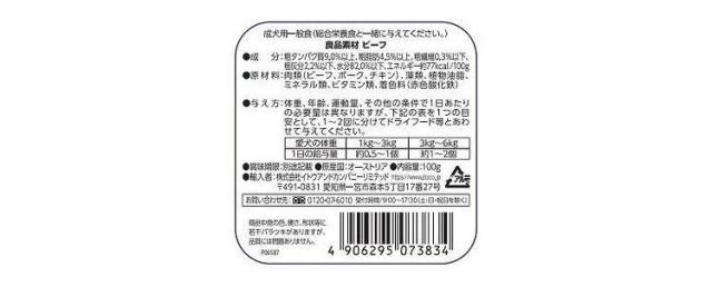 肉類(ビーフ、ポーク、チキン、ターキー)、ビタミンD3、ミネラル類、増粘安定剤(カラギーナン)、植物性油脂、着色料(赤色酸化鉄)