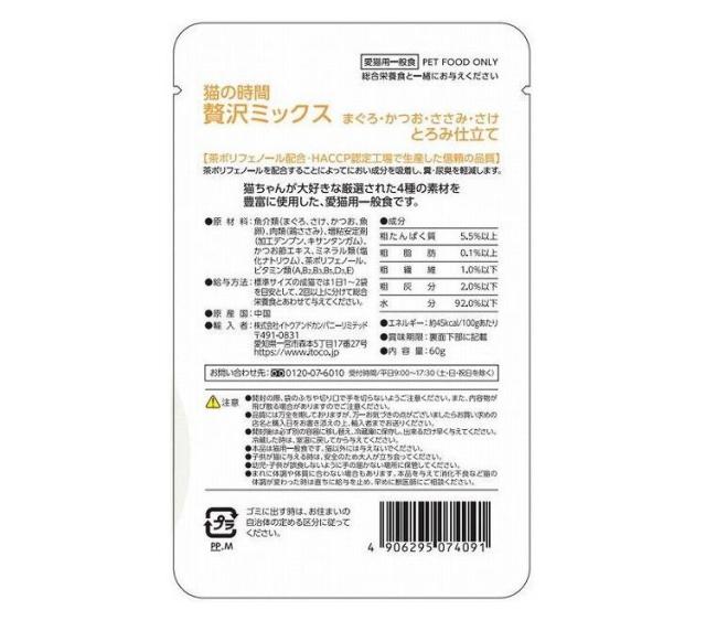 魚介類(まぐろ、サーモン、かつお、魚卵)、肉類(鶏ささみ)、増粘安定剤(加工デンプン、キサンタンガム)、ミネラル類(塩化ナトリウム)、かつお節エキス、茶ポリフェノール、ビタミン類(A、B2、B3、B5、D3、E)