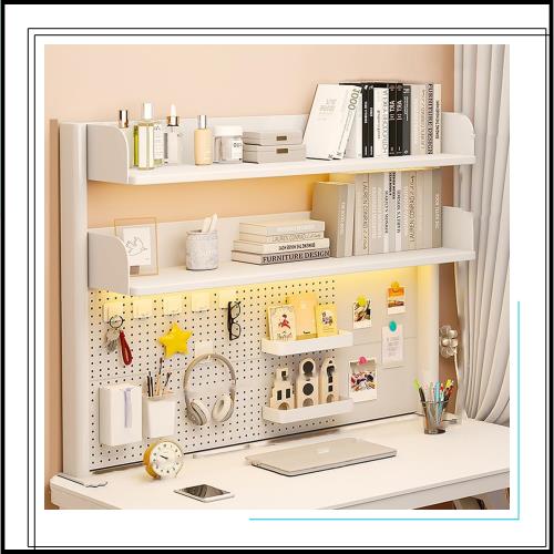 3.【効率的にスペース活用】 有孔ボードが机上シェルフに付いております。イヤホンや鍵などの小物を垂直面に収納することで、デスク周りがすっきりと片付き、作業スペースをより広く使えるようになります。 【贈り物】便利収納グッズをお贈り致します:ペン入れ1個、ティッシュ箱1個、ボックス1個、U字フック2個、L字フック10個、ペッグフック6個と磁石10個。レイアウトを自由に配置でき、アイテム次第で使い方が広がります。