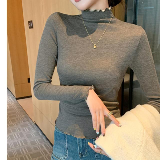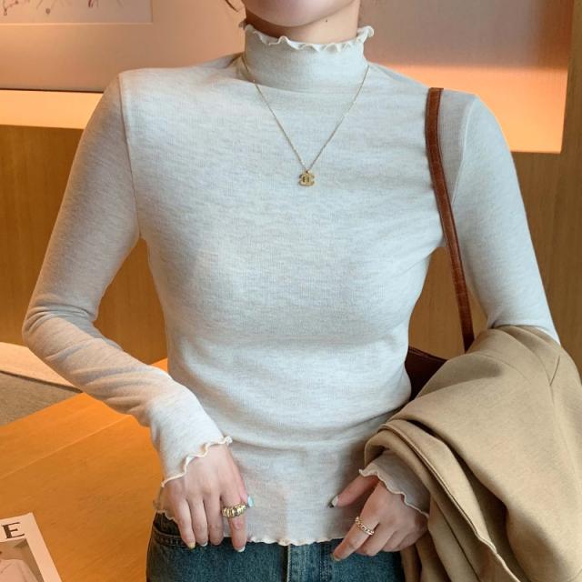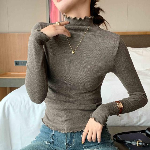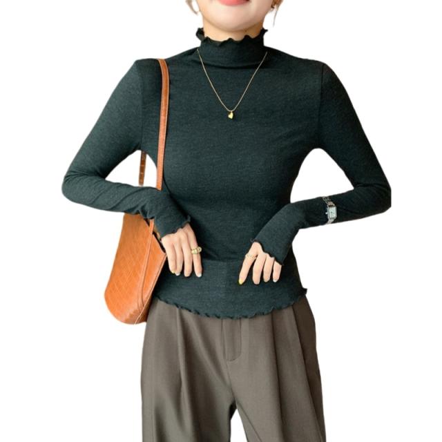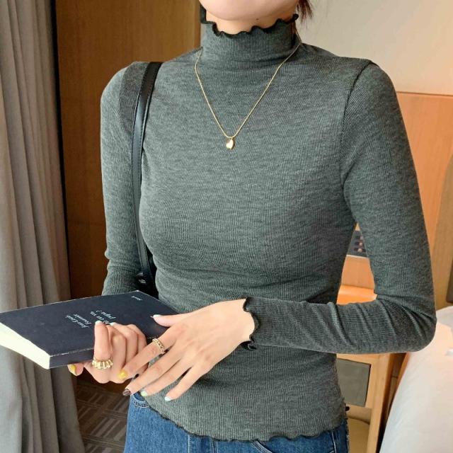 カットソー レディース 長袖 ハイネック 木目フリル リブトップス タートルネックTシャツ スリムフィット 無地 シンプル インナー 大人可愛い 韓国ファッション 着回し 秋 冬 ブラック グレー ホワイト ブラウン