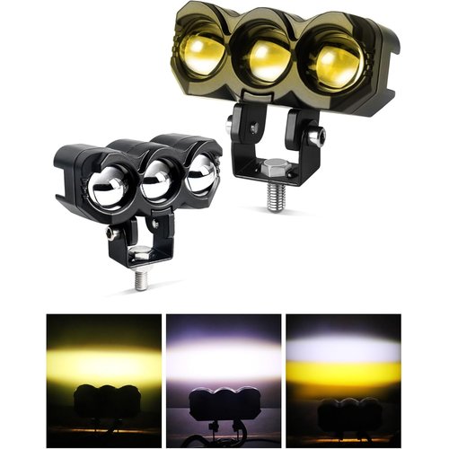 ??【3モード発光】バイクフォグランプは、ホワイト/イエロー/ホワイト+イエローの3モード切替可能!3個の大出力5730 LEDチップ搭載。ロービームはイエロー(3000K)、ハイビームはホワイト(6000K)、双灯は自由選択。琥珀色の光は透過力が高く、夜間走行をより安全にサポート!