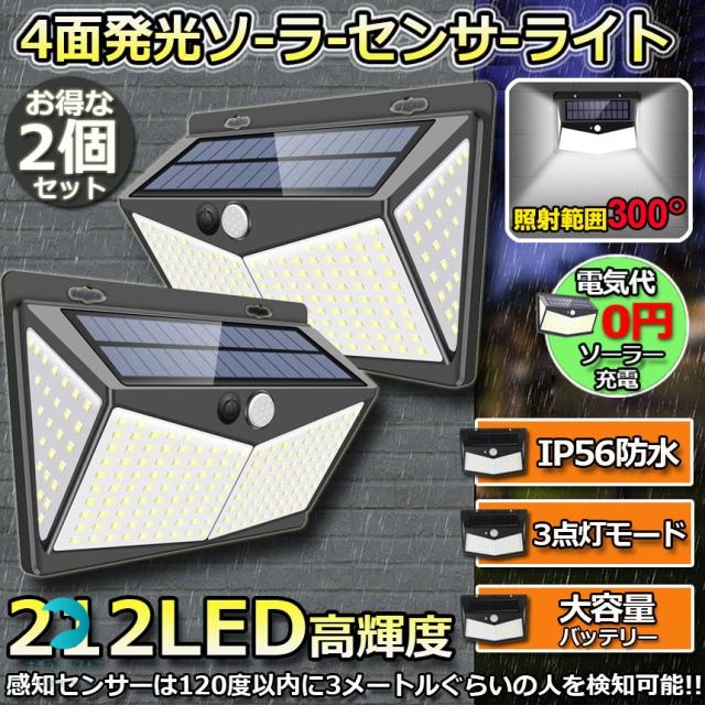 センサーライト ソーラーライト 212LED 2点セット 4面発光 3つ知能モード 人感センサー 屋外照明 太陽光発電 省エネ 防水 防犯ライト 自動点灯/消灯 壁 庭 柵 ガレージ 玄関 駐車場 地震 停電