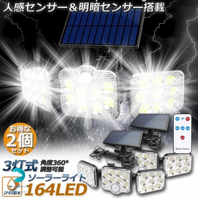 ソーラーライト 2台セット 164LED 3灯式 リモコン付き 5mコード付き センサーライト 防犯ライト ガーデンライト アウトドア ソーラーフラッドライト モーションセンサー付き キュリティライト 照明 IP65防水 防犯 人感 防水 屋外照明 太陽光発電