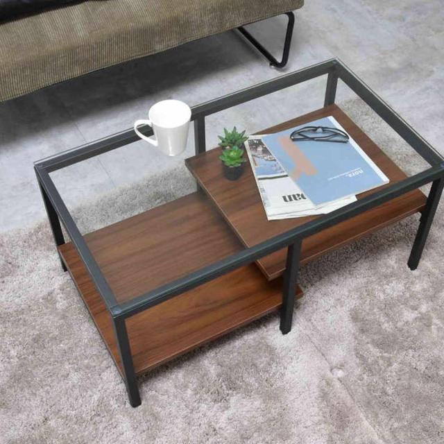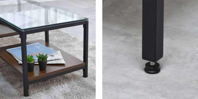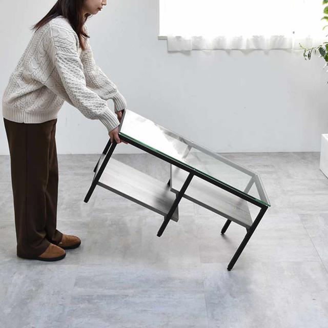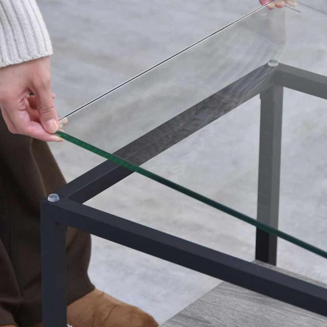 強化ガラス製の天板と、左右で高さの異なる棚板を備えたアシンメトリーデザインのセンターテーブルです。透明なガラス天板は圧迫感を抑えながら、抜け感のある美しい空間を演出。棚板にはリモコンや雑誌などを収納できるほか、高さに変化を持たせていることで、お気に入りのアイテムのディスプレイも楽しめます。