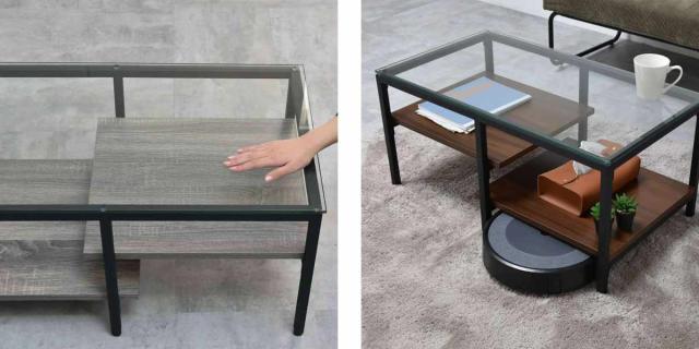 | お手入れ簡単 ガラス天板と、メラミン樹脂を使用した棚板は水や汚れに強いので、水をこぼしてもサッと拭き取れます。 | お掃除ロボットが通れる 床から棚板までの高さは10cmでお掃除ロボットが通れるため、テーブルを動かさずにラクに掃除できます。 |