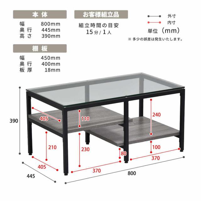 | 材質 | 天板:8mm強化ガラス 棚板:中質繊維板(メラミン貼り) 脚:スチールパイプ(粉体塗装) |