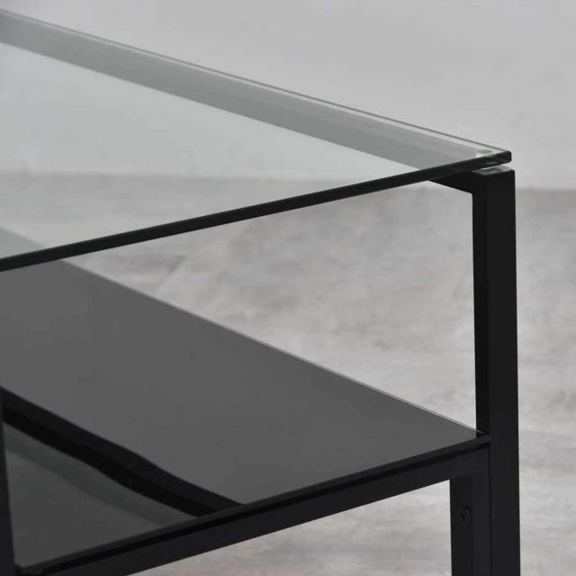天板と棚板に強化ガラスを使用したセンターテーブルです。透明な天板が圧迫感を軽減し、裏面にカラーを入れたガラスの棚板が空間にアクセントを加えます。マットな質感のアイアンフレームとガラスの艶やかさが調和し、モダンで洗練された雰囲気を演出。透け感のあるデザインで、幅広いインテリアにマッチします。
