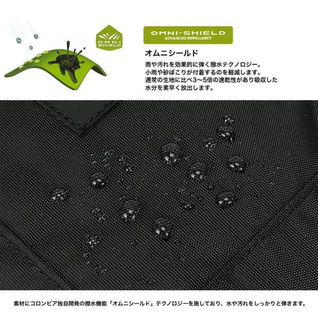 素材にコロンビア独自開発の撥水機能「オムニシールド」テクノロジーを施しており、水や汚れをしっかりと弾きます。