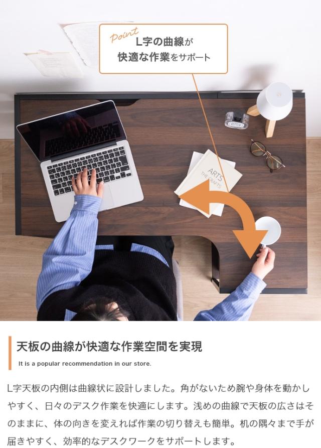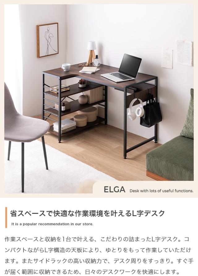 | 説明 | 作業スペースと収納を1台で叶える『Elga(エルガ)』L字デスク。コンパクトながらもL字構造の天板により、ゆとりをもって作業いただけます。天板内側は曲線上にすることで、腕や体を動かしやすい設計に。また可動棚付きのサイドラックやコードタップ収納、S字フックが付属しており、日々のデスクワークを快適にするこだわりの詰まったデスクです。 |