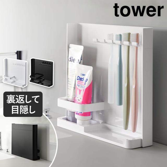 裏返して隠せる 歯ブラシスタンド 歯みがきグッズの収納に便利な『 tower( タワー )目隠し歯ブラシ&チューブスタンド 』。ハブラシ5本と歯みがき粉チューブ2本をまとめて、洗面台まわりを整理整頓できます。裏返すと目隠し収納ができるので急な来客時も安心。サニタリールームや水周りに省スペースに置ける薄型設計ながら、電動歯ブラシや替えブラシも収納できます。ハブラシをホルダーに吊り下げて収納するので、ぬめり防止になって衛生的。底面のトレーは着脱式でお手入れ簡単です。
