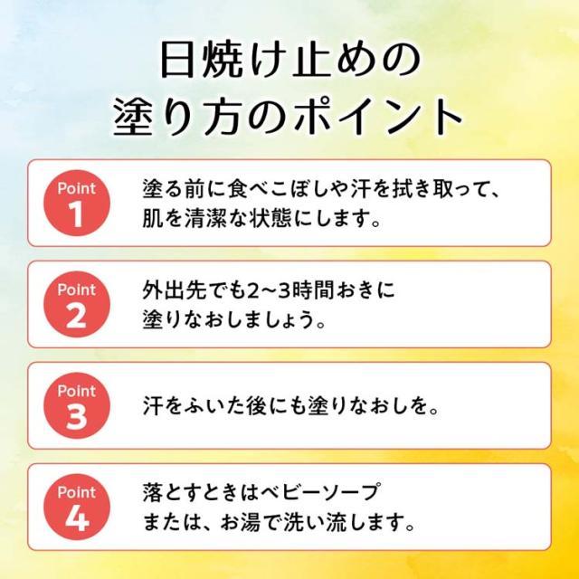 ・赤ちゃんのお肌に配慮してつくられたウォータープルーフタイプの日やけ止めです。敏感肌の方にもお使いいただけます。