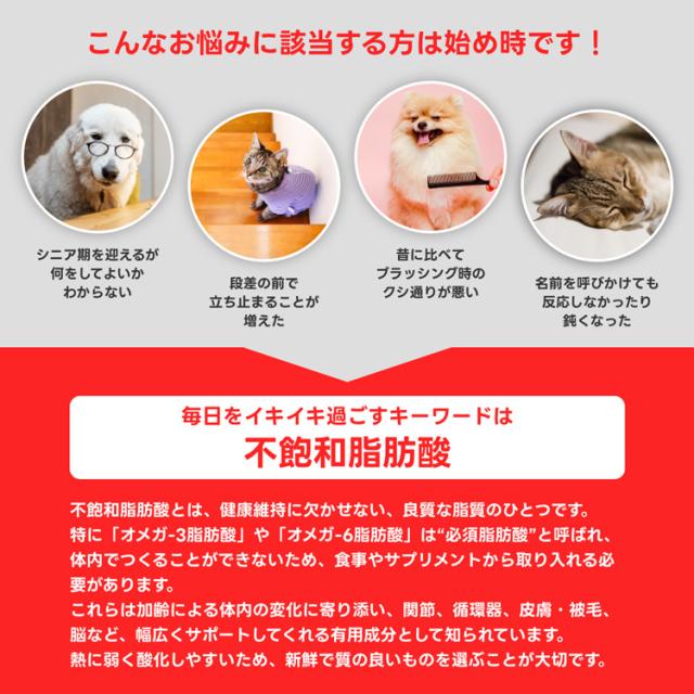 これらは加齢による体内の変化に寄り添い、関節、循環器、皮膚・被毛、脳など、幅広くサポートしてくれる有用成分として知られています。