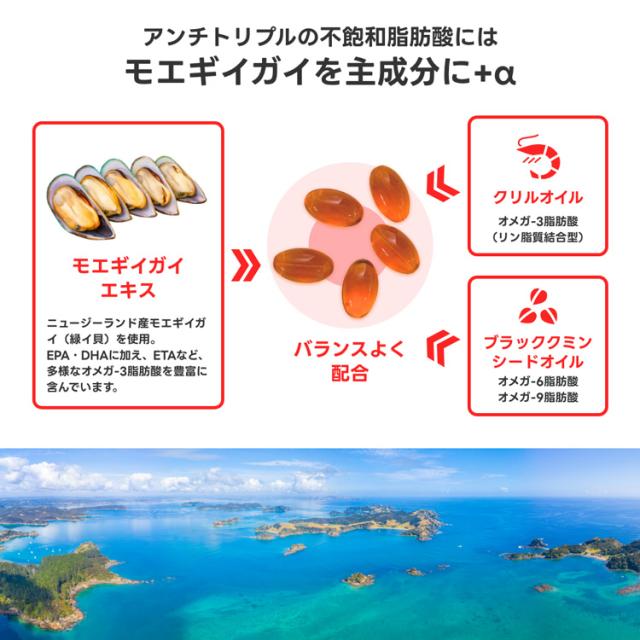 アンチトリプルではニュージーランドで60年以上にわたり、独自に研究開発を行う、AROMA社製の新世代モエギイガイ成分「GlycOmega-PLUS(TM)」を採用しています。