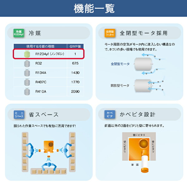 | 商品説明 | ●ノンフロン型業務用スポットエアコン ●ノンフロン冷媒:R1234yf採用 ●フロン排出抑制法の対象外なので3ヶ月に一度の簡易点検と廃棄時のガス回収の手間やコストが軽減 ●冷風1口 ●自動首振りなし ●冷房能力(50/60Hz)2.1/2.3kW ●消費電力(50/60Hz):0.83/1.04kW ●電気料金:25.7円/h |