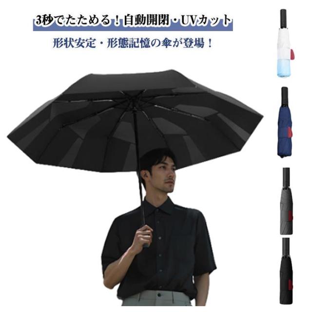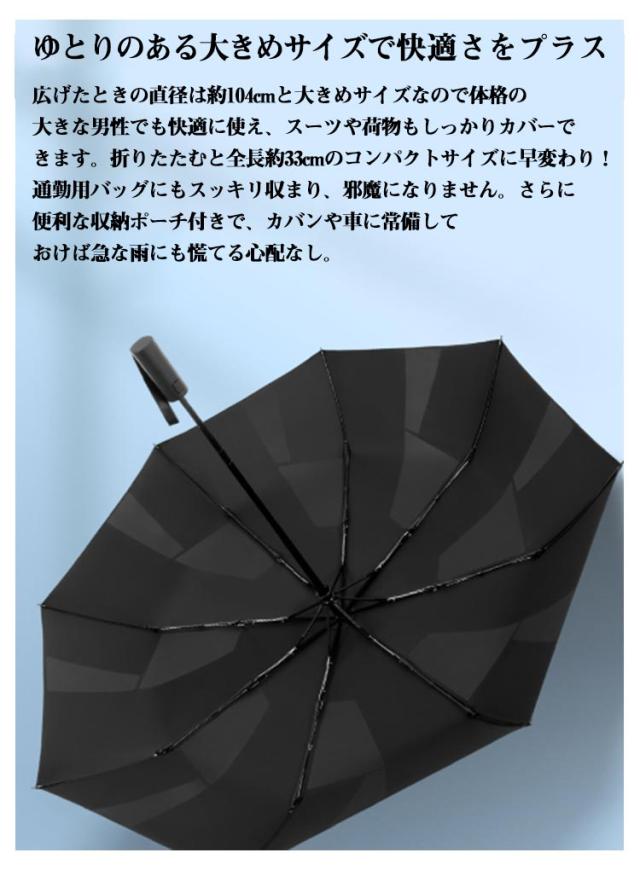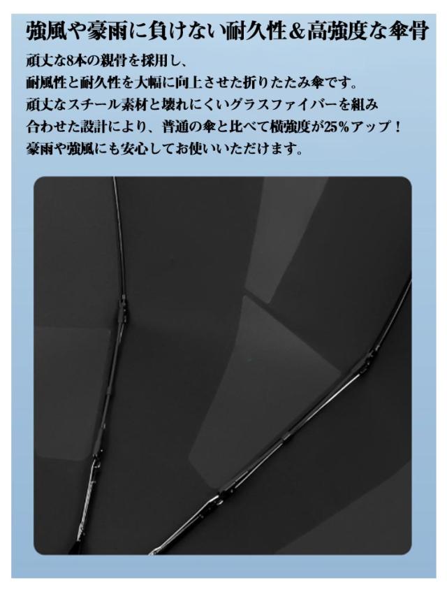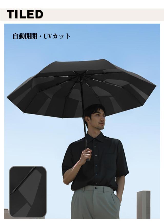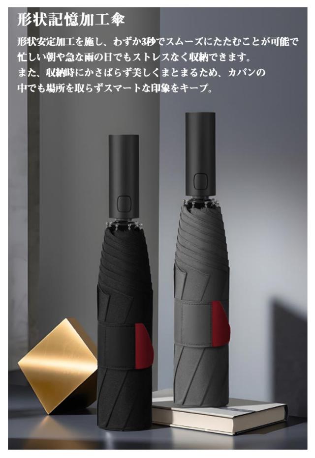 | 3秒でたためる! 形状安定・形態記憶の傘が登場! 自動開閉・UVカット 【形状記憶加工傘】形状安定加工を施し、わずか3秒でスムーズにたたむことが可能で、忙しい朝や急な雨の日でもストレスなく収納できます。また、収納時にかさばらず美しくまとまるため、カバンの中でも場所を取らずスマートな印象をキープ。 【ゆとりのある大きめサイズで快適さをプラス】広げたときの直径は約104cmと大きめサイズなので、体格の大きな男性でも快適に使え、スーツや荷物もしっかりカバーできます。折りたたむと全長約33cmのコンパクトサイズに早変わり!通勤用バッグにもスッキリ収まり、邪魔になりません。さらに、便利な収納ポーチ付きで、カバンや車に常備しておけば急な雨にも慌てる心配なし。 【強風や豪雨に負けない耐久性&高強度な傘骨】頑丈な8本の親骨を採用し、耐風性と耐久性を大幅に向上させた折りたたみ傘です。頑丈なスチール素材と壊れにくいグラスファイバーを組み合わせた設計により、普通の傘と比べて横強度が25%アップ!豪雨や強風にも安心してお使いいただけます。 【ワンタッチ自動開閉傘・忙しい日常にぴったり!】ボタンを軽く押すだけで、自動で開閉が可能な便利な折りたたみ傘。車の乗り降り時や、子どもを抱っこしている時、荷物で手がふさがっている時にもスムーズに使えます。折りたたみ式なので、出張や旅行のお供としても最適。 | |