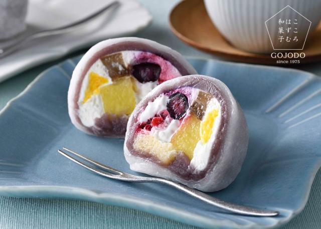 5種のフルーツ(ブルーベリー・オレンジ・バナナ・フランボワーズ・パイナップル)に生クリームを合わせ、きめ細かなこし餡と羽二重餅で包んだ洋テイストの大福。フルーツの甘酸っぱさと、餡やクリームのコクが見事なバランスで、さまざまな風味が口の中でふわっと広がる感覚が、まさに花火のよう!