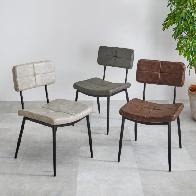 レザー調生地とブラックフレームが、レトロ感のあるアメリカンヴィンテージな雰囲気を演出します。座面と背もたれに大きなステッチが施された、シンプルながら印象的なデザインです。