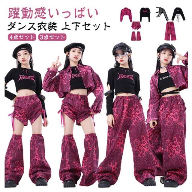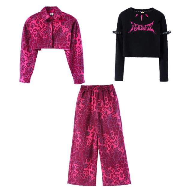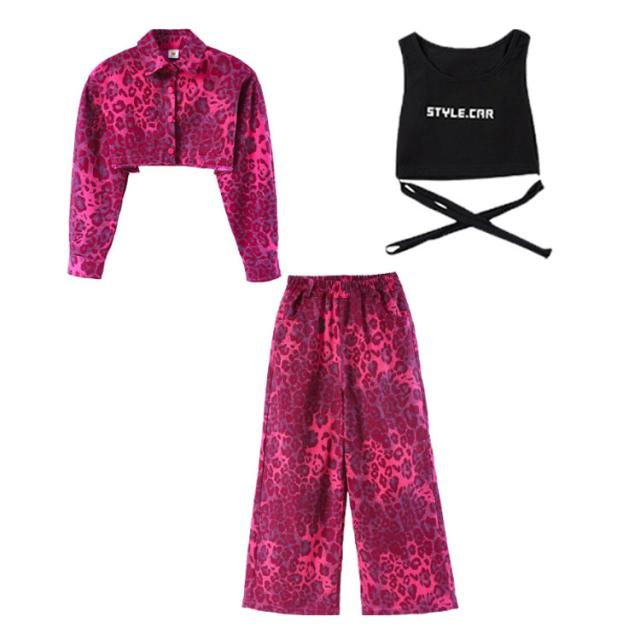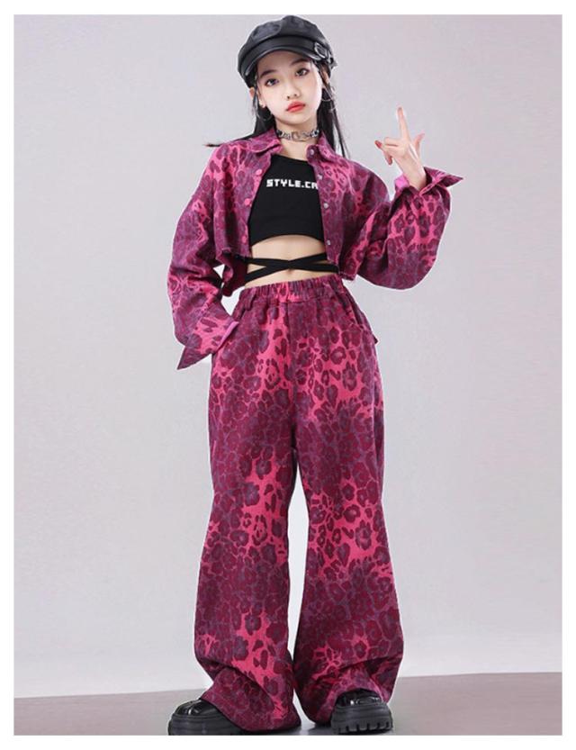 ヒップホップ 韓国 セットアップ キッズ 女の子 上品 上品 チアガール チア 豹柄 ダンス衣装 ピンク トップス ファッション ヒョウ柄 サルエルパンツ レッグウォーマー デニム生地 ジャズダンス 発表会 演出服 団体服 練習着 ストーリー系 原宿系 ギャル系 おしゃれ