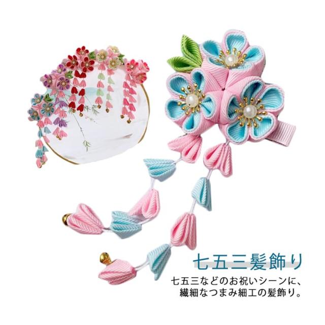 | 七五三髪飾り 七五三などのお祝いシーンに、繊細なつまみ細工の髪飾り。 水引飾りが可愛い七五三髪飾り!3才、7才 小学生の卒業式にも! 1つあればお顔周りがパッと華やぐので、特別な日の装いのワンポイントとして最適です。 | |
