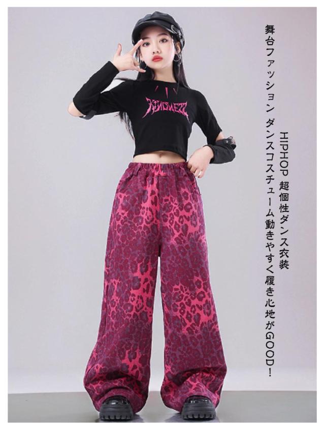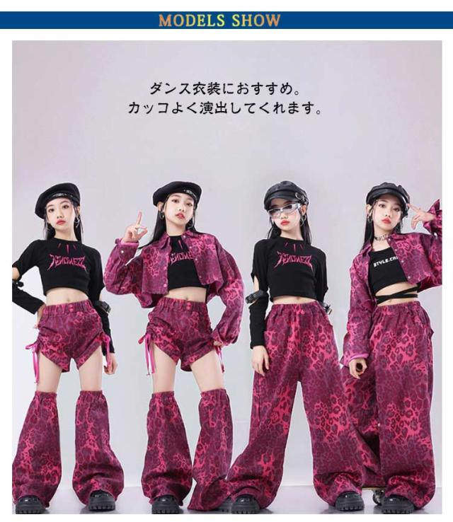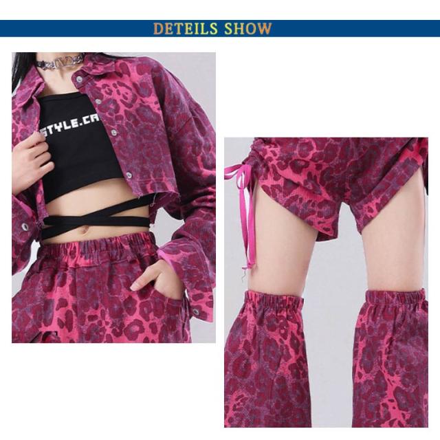 k-pop 団体服 上品 セットアップ キッズ ダンス衣装 チア 女の子 ピンク チアガール デニム生地 韓国 豹柄 トップス ヒョウ柄 サルエルパンツ レッグウォーマー ヒップホップ ジャズダンス 発表会 演出服 ファッション 練習着 ストーリー系 原宿系 ギャル系 おしゃれ
