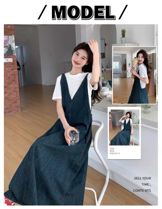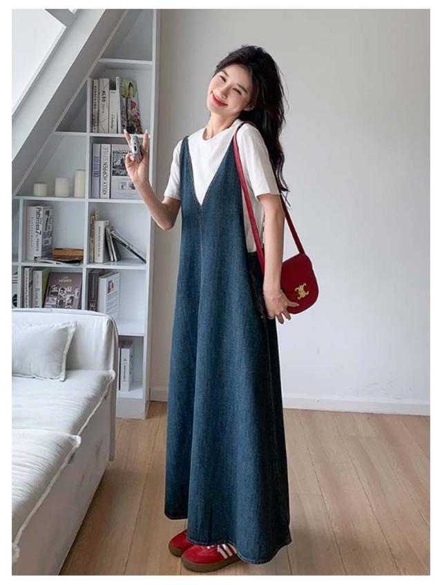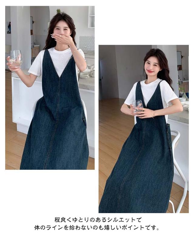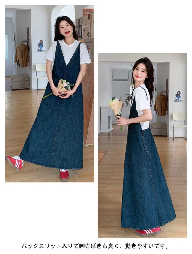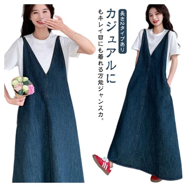 ジャンパースカート デニム レディース デニムサロペットスカート ゆったり Vネック サロペット ジャンスカ ワンピース フレア ロング デニムサロペットスカート 春夏秋冬 オーバーオール オールインワン レイヤード 重ね着