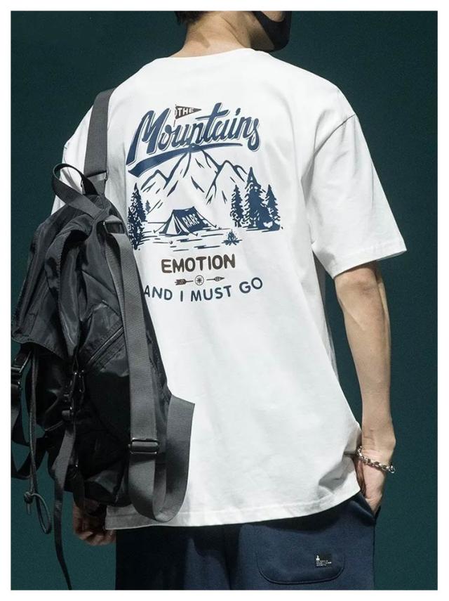 半袖 送料無料 英字 古着風 カットソー 丸首 バックプリント 山 レトロ メンズ 送料無料 トップス アメカジ プリント ストリート カジュアル 大人 オーバーサイズ 大きいサイズ グレー 白 黒